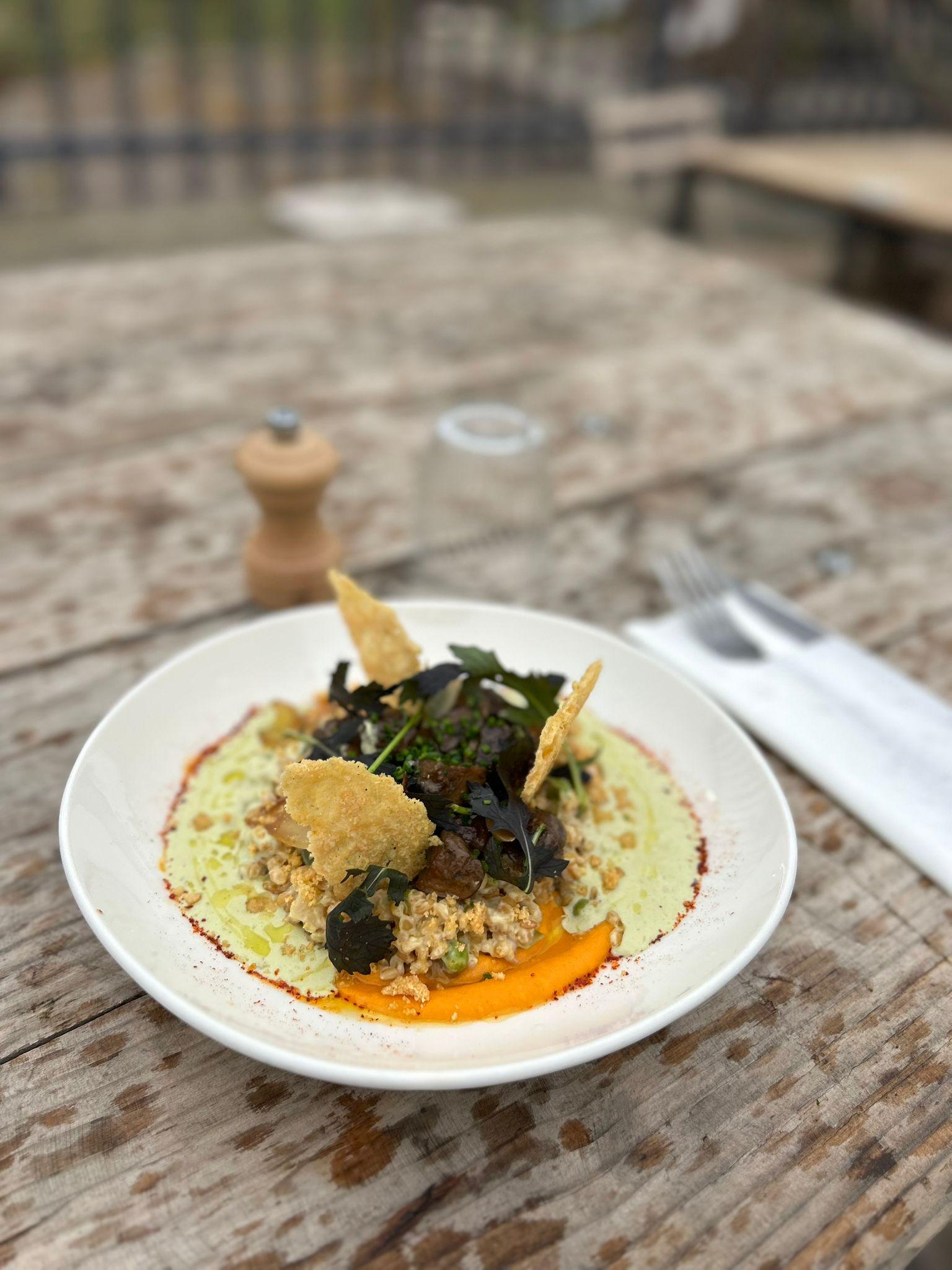 Risotto de petit épeautre et légumes verts, poêlée de champignons, crème aux herbes, crumble aux amandes