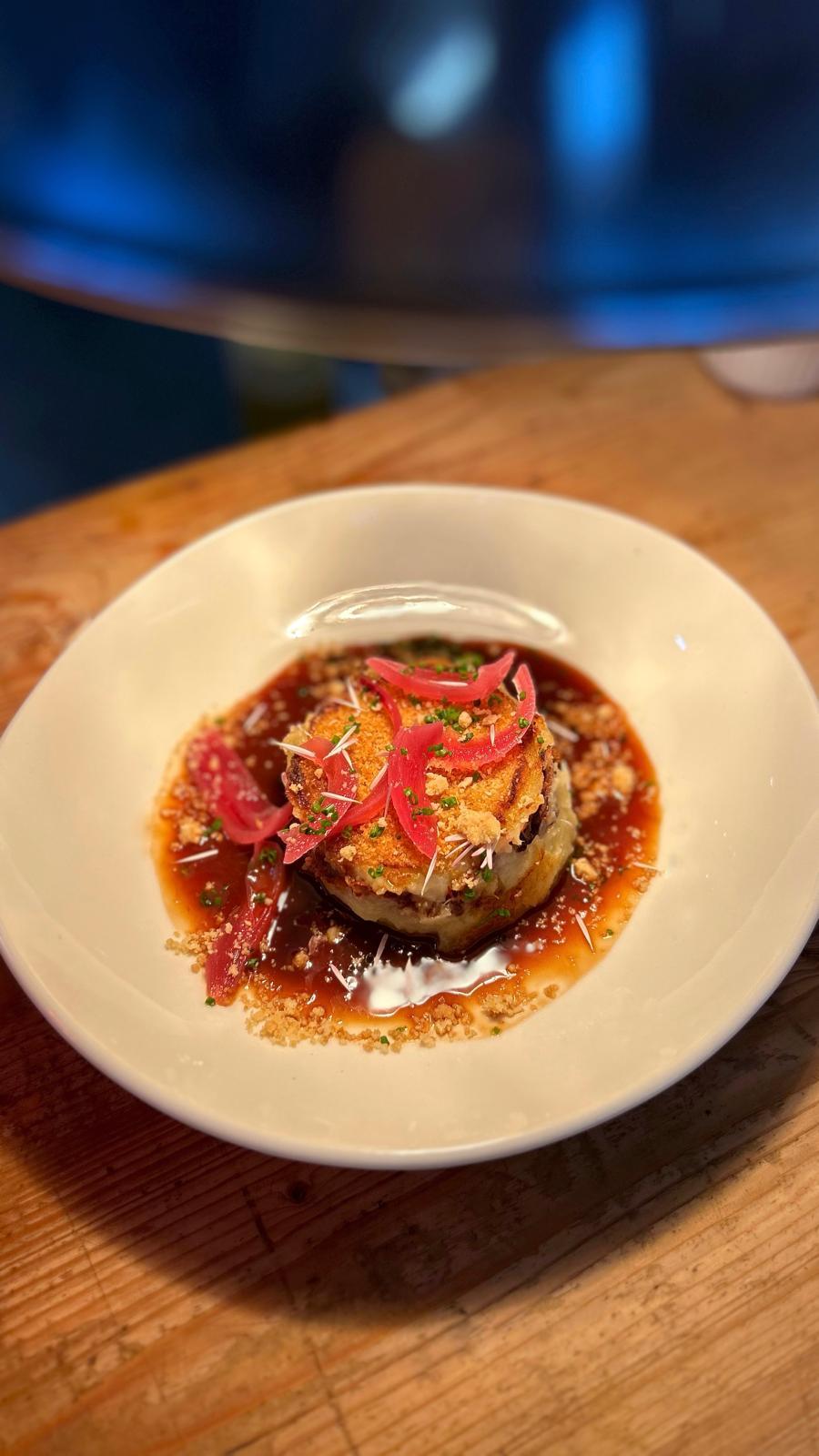 L’éffiloché de boeuf : Boeuf cuisson basse température (env. 150 gr), pickles de choux rouges & blanc, oignons frits, coriandre, jus réduit, sauce base mayo, yaourt et menthe – 15 €