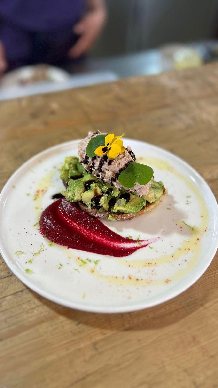 Toast de pain de campagne ®Boulangerie Claudette (Hérault), écrasé d’avocat citronné, émietté de thon et sa mayonnaise maison, pickles de betterave