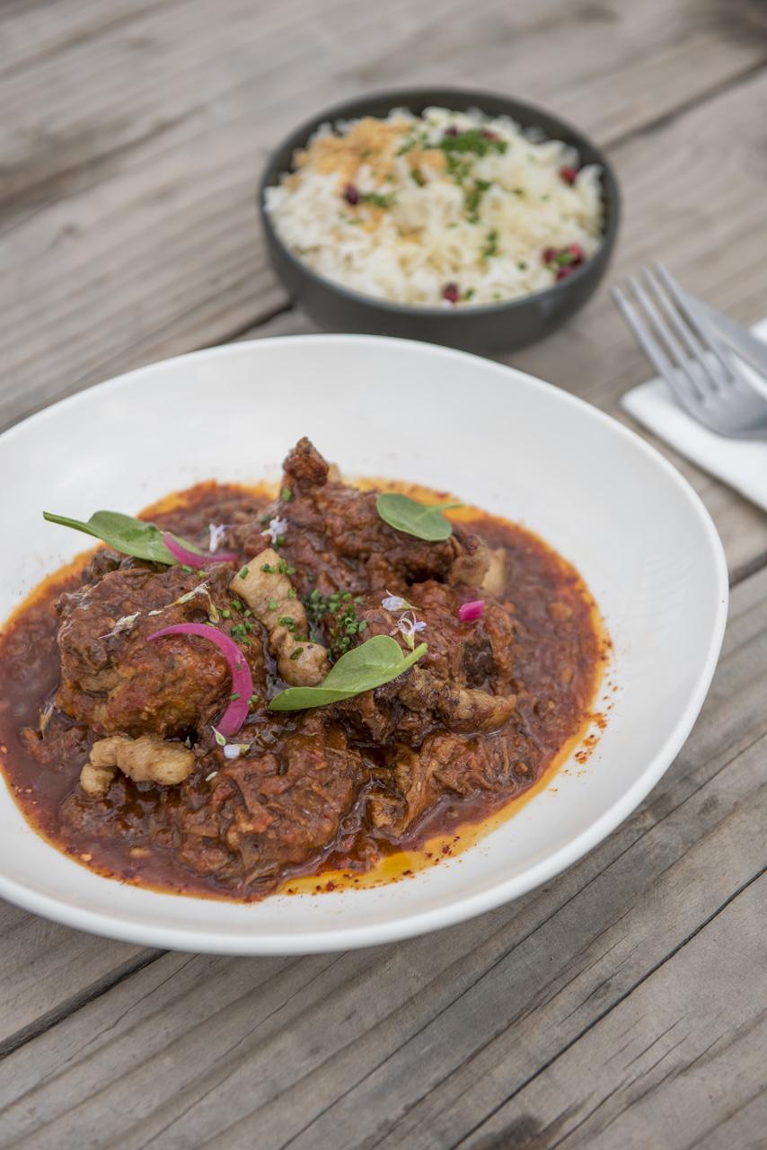 L’éffiloché de boeuf : Boeuf cuisson basse température (env. 150 gr), pickles de choux rouges & blanc, oignons frits, coriandre, jus réduit, sauce base mayo, yaourt et menthe – 15 €