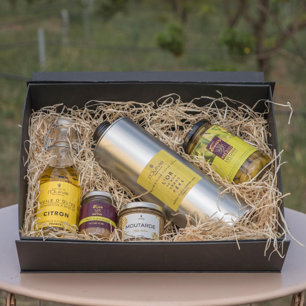 Coffret « L’Olive ★★★★★ » entièrement composé de produits artisanaux, issus de nos oléiculteurs locaux :